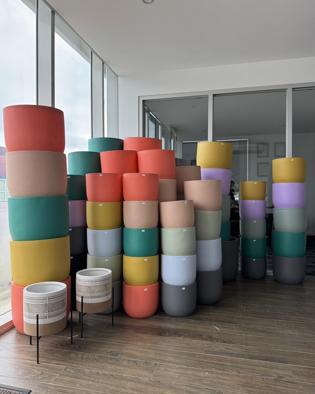 Tons of different coloured high quality, lightweight fibreglass pots available in store!